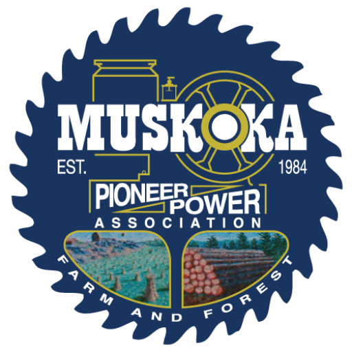 In February of 1984, 23 people assembled to get this idea underway. All present agreed to become directors of the Club for the first year and everyone was asked to submit names for the Club and design a logo. All this came together within the first two or three meetings and the Muskoka Pioneer Power Association was born. The logo, as shown above, incorporates a likeness of a stationary engine. It was decided to have this painted on a large 48″ circular saw blade and secured to a plywood backing. Jeff Kirton, an Ontario College of Art student, did a fine job of accomplishing this task. This sign would be taken to events to promote the Association. Farm and forest industries became the focus of our mission, and it was decided to preserve this heritage which was so significant to Muskoka. These two industries were very important in opening up this area and without them Muskoka would not be what it has become today.